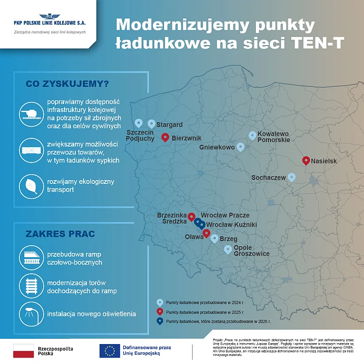 Projekt „Prace na punktach ładunkowych zlokalizowanych na sieci TEN-T”, współfinansowany z programu CEF Military Mobility oraz Programu Pozamilitarnych Przygotowań Obronnych RP, zakłada przebudowę punktów ładunkowych łącznie na trzynastu stacjach w latach 2024-2026.