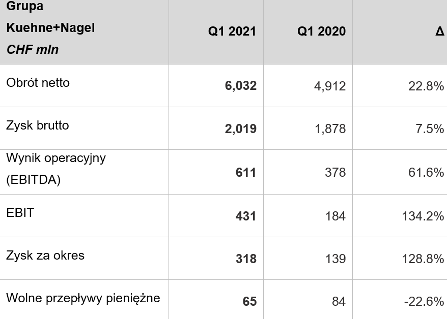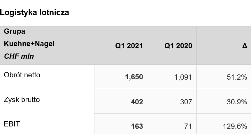 W pierwszym kwartale 2021 dywizja logistyki lotniczej po raz pierwszy od ponad dwóch lat odnotowała wzrost wolumenu sprzedaży. Kontrastuje to z ograniczonymi zdolnościami przewozowymi na świecie. Doświadczenie Kuehne+Nagel w radzeniu sobie z tym wąskim gardłem było szczególnie istotne w transporcie towarów podstawowych i farmaceutycznych.