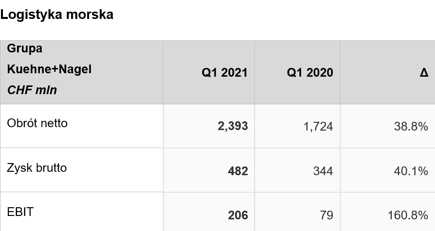 Odwrócenie pozytywnego trendu dywizji logistyki morskiej z drugiej połowy 2020 dotyczącego wskaźników związanych z zyskiem było kontynuowane w pierwszym kwartale 2021. Kuehne+Nagel sprostało niezwykle wysokim wymaganiom klientów, szczególnie w USA w warunkach ograniczonych pojemności kontenerów, zmniejszonej produktywności terminali i rosnącego popytu. Wzrost wolumenu był szczególnie zauważalny w segmencie dóbr konsumpcyjnych.