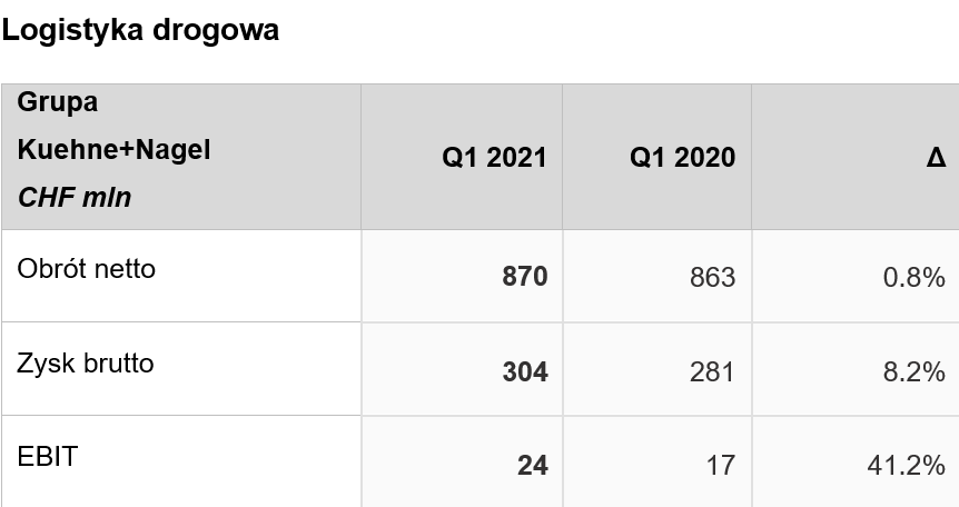 W I kwartale 2021 logistyka kontraktowa powróciła do organicznego wzrostu na poziomie 4%, zgodnie z warunkami rynkowymi. W wyniku zbycia części brytyjskiej firmy z dniem 1 stycznia 2021 obroty w pierwszym kwartale 2021 spadły.