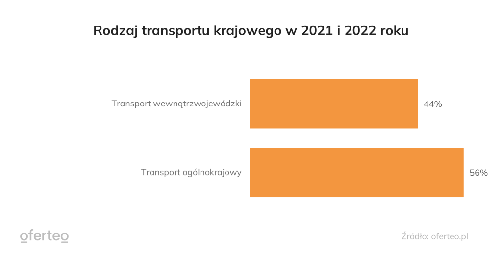 Transport krajowy może być zlecany w obrębie jednego województwa lub może mieć charakter ogólnopolski. Przez ostatnie dwa lata ten pierwszy typ usługi stanowił 44% wszystkich zleceń krajowych. Usługi transportu między województwami stanowiły natomiast 56%. Najczęściej miejscami załadunku były obszary o wysokiej gęstości zaludnienia, takie jak województwa mazowieckie czy śląskie. W latach 2021 i 2022 ich udział w liczbie zleceń w skali kraju stanowił odpowiednio 12 i 18% wśród miejsc rozpoczęcia usługi (tzw. załadunku). Podobną sytuację można było zaobserwować w przypadku miejsc rozładunku.
